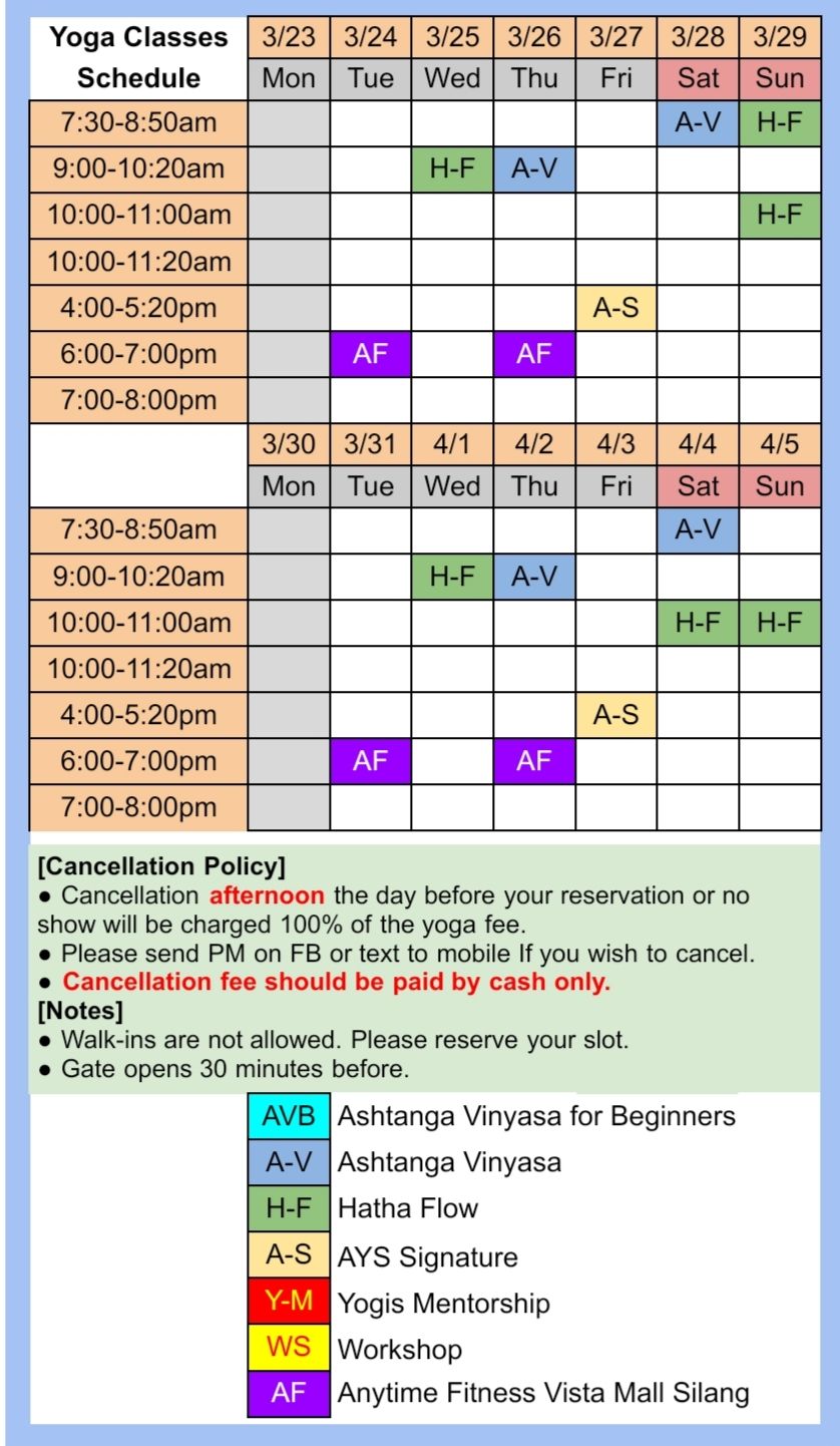 Here is the schedule for Ann Yoga Studio in Silang, Cavite.